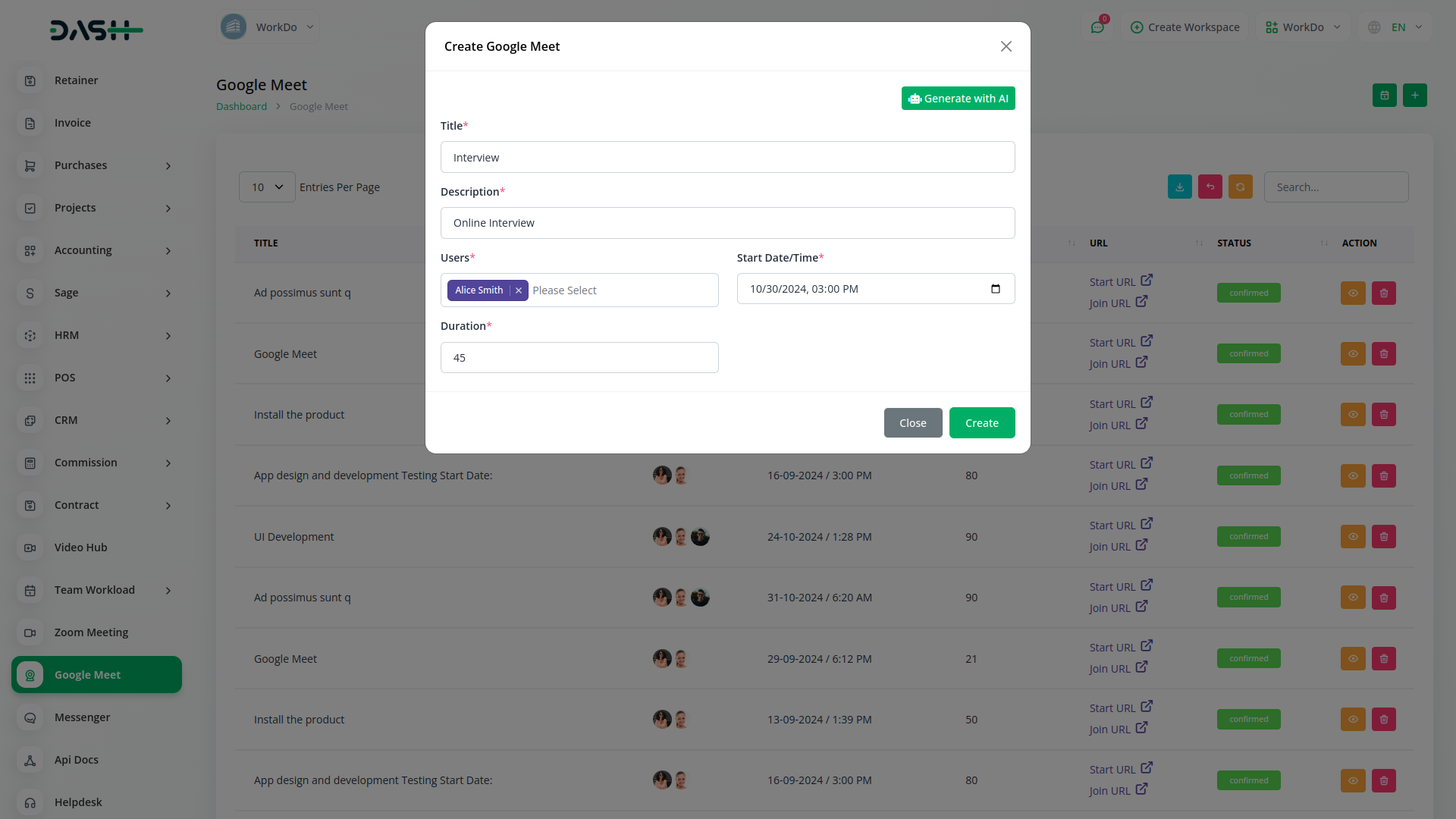 Empower your team with the ability to create and schedule Google Meet sessions instantly from within Workdo-Dash. Simplify your virtual meeting experience by seamlessly generating Google Meet links, enhancing team collaboration and communication.